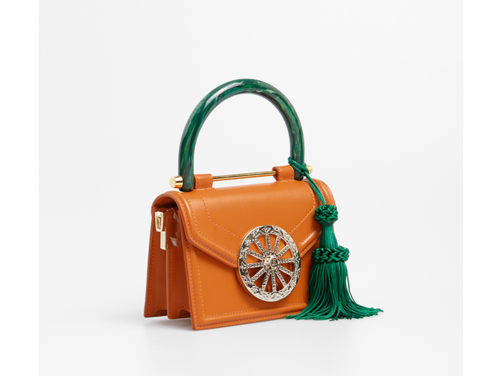 uzavíratelná zipem. Má originální akrylátovou rukojeť a také kožený nastavitelný popruh.