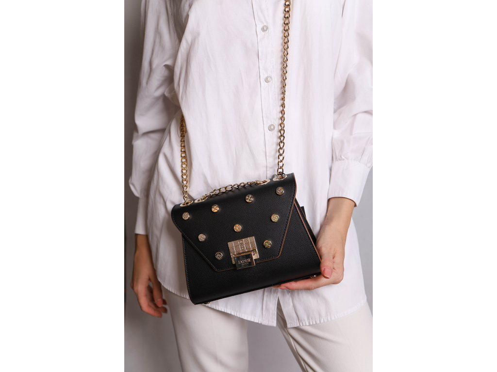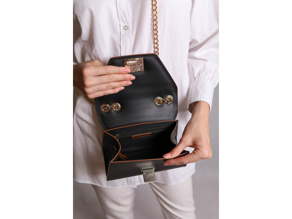 Řetízkový ramenní popruh je uprostřed nahrazen černou kůží k pohodlnému nošení na rameni.