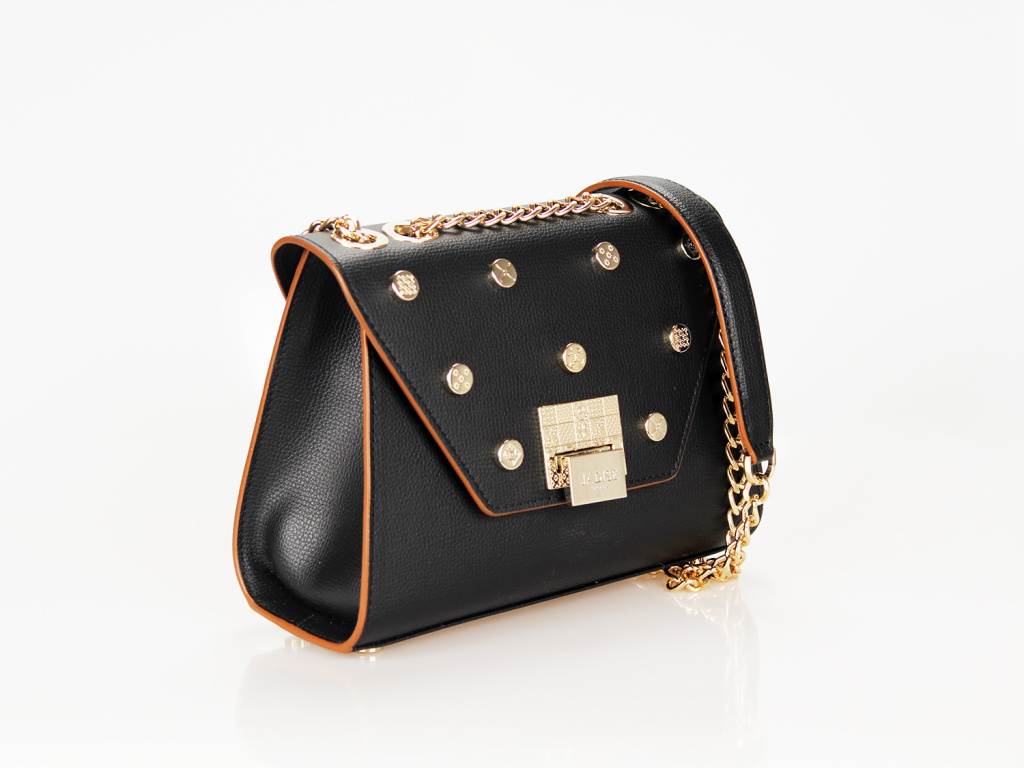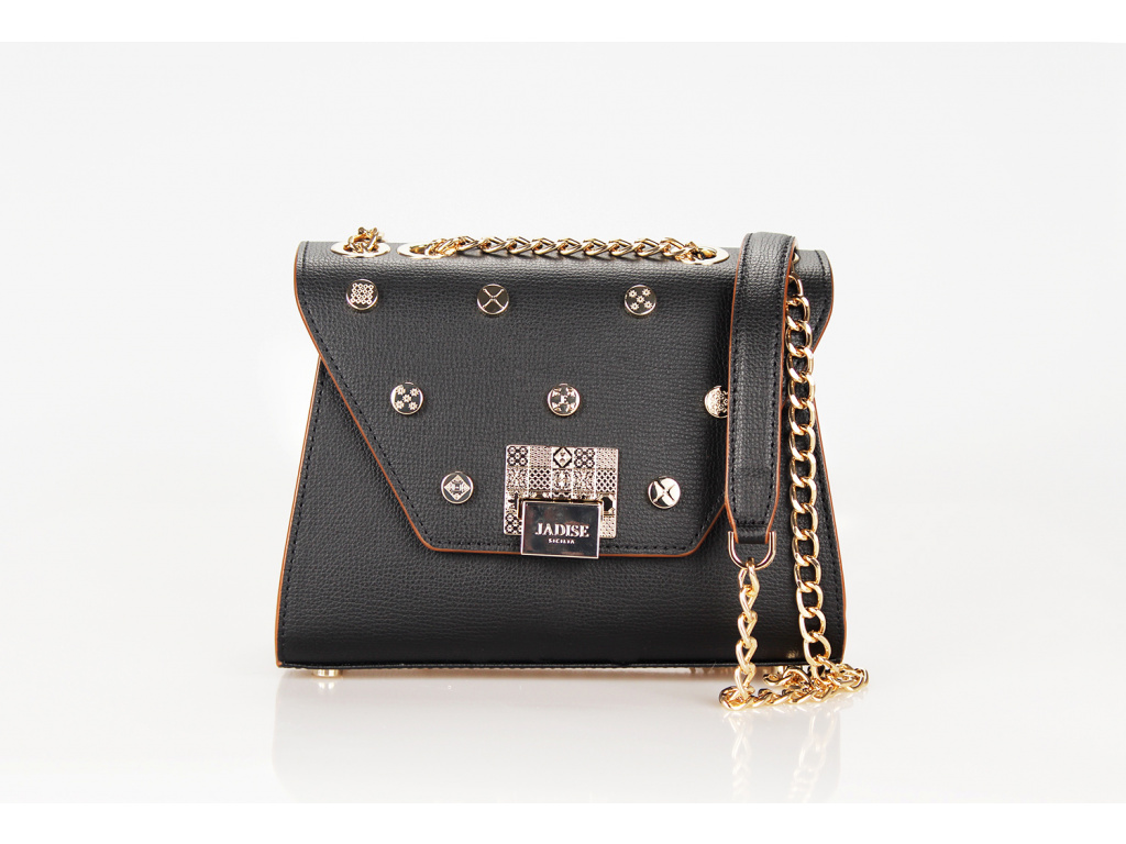Kabelka je vyrobena z pevné hovězí kůže černé barvy. Elegantní černou barvu na přední klopě ozvláštňují cvočky s vyraženou majolikou. Uzavřít se dá díky elegantnímu pákovému uzavírání s logem JADISE. Uvnitř je jeden prostor s víceúčelovou malou kapsičkou + kapsičkou uzavíratelnou zipem.
